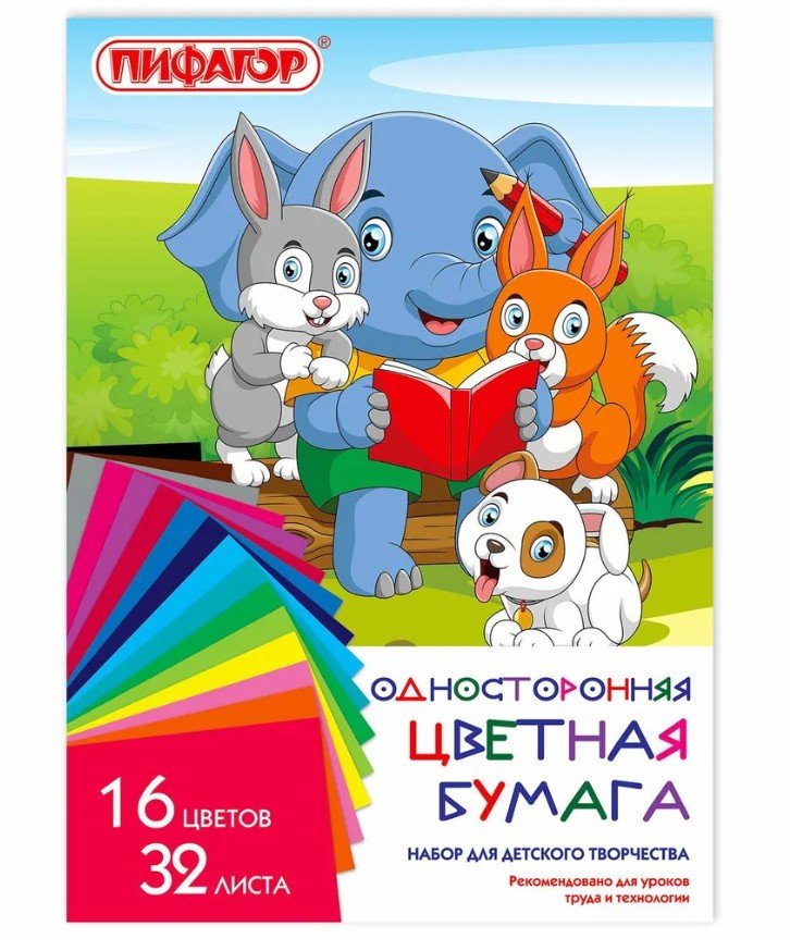 Цветная бумага А4 газетная, 32 листа, 16 цветов, на скобе, ПИФАГОР, 200х280 мм, "Друзья", 115486 (арт. 115486) Набор газетной односторонней цветной бумаги плотностью 50 г/м2 включает 32 листа формата А4 (200х280 мм) в 16-и разнообразных и насыщенных однородных цветах. Листы скреплены скобами, легко режутся и сгибаются.