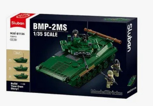 Модель боевой машины пехоты БМП-2 включает 738 деталей для сборки, 3 мини-фигурки, разделитель для кубиков и подробная инструкция по сборке.