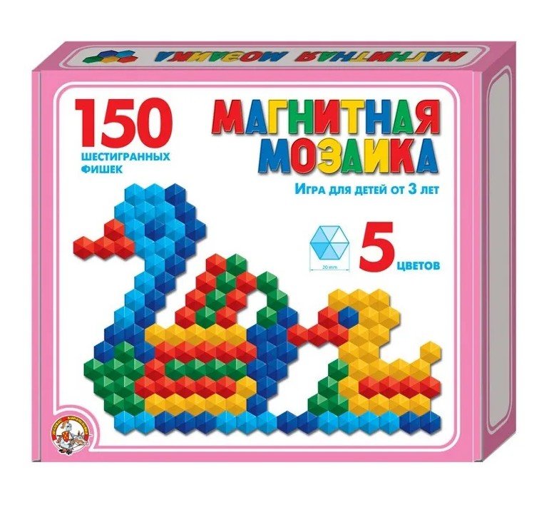 Мозаика магнитная шестигранная без игрового поля включает в себя 150 фишек, размером 20 мм и 5 цветов.