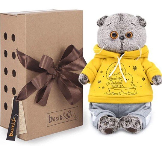 Басик — галантный вислоухий шотландец с трогательными глазками и усиками-ниточками, торчащими во все стороны. Дымчатый шотландец "живет" в подарочной коробке-переноске из плотного крафт-картона украшенной атласной лентой. Очень презентабельно и стильно!