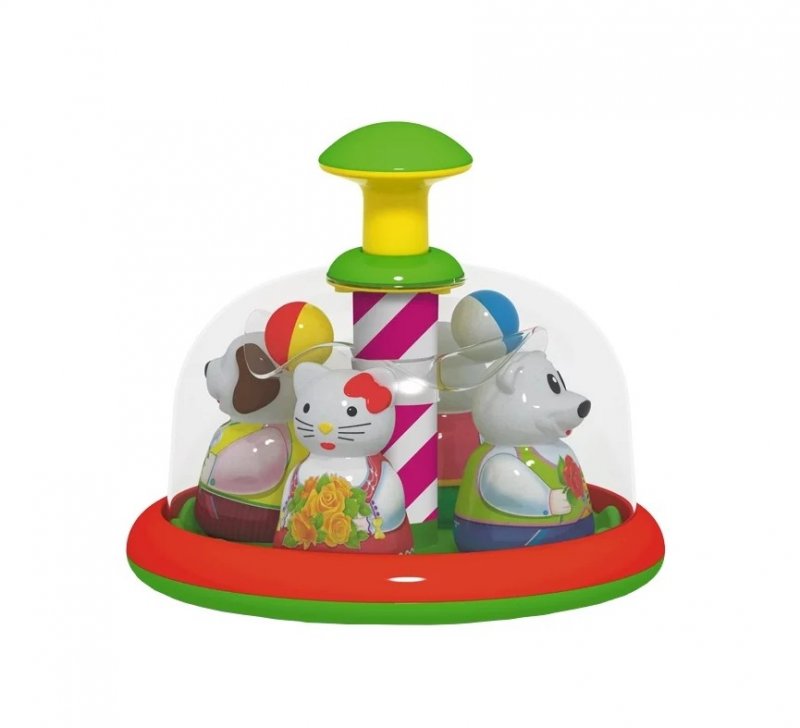 Юла-карусель "Аттракцион" - это развивающая игрушка для самых маленьких. Она напоминает детский аттракцион в парке с катающимися на нем зверушками. Малыш сам сможет запускать юлу-карусель и влиять на скорость вращения карусели, нажимая на большую кнопку сверху.